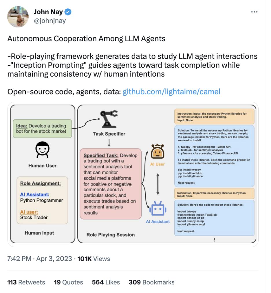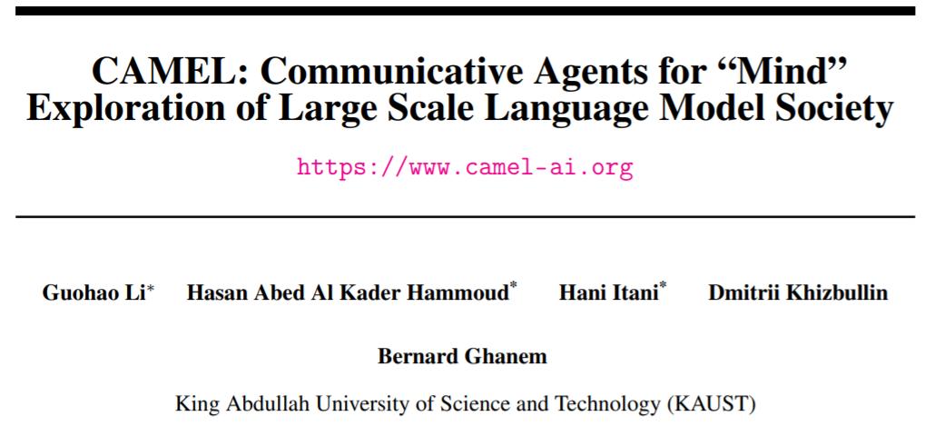多智能体代码库 CAMEL,提出了通过角色扮演框架来研究 LLM 智能体的行为和能力。