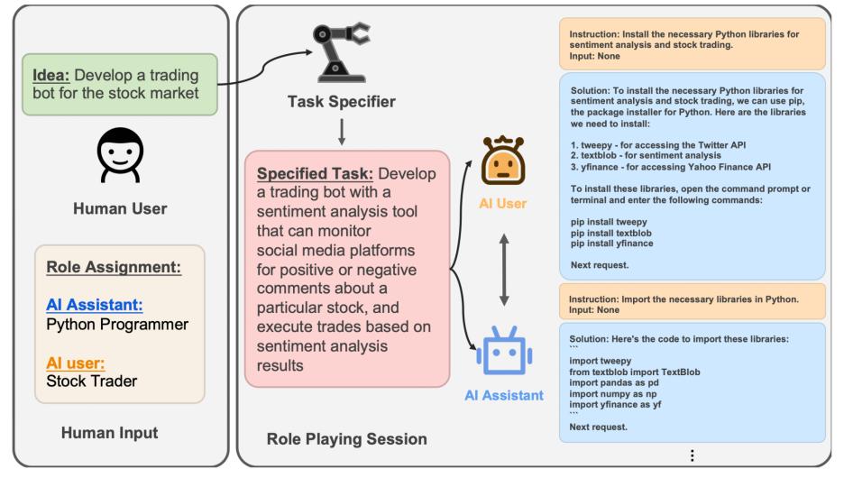 角色扮演会话将根据人类的想法和选择的角色实例化。例如,在图 1 中,一个人有一个初步想法,要开发一个股市交易机器人。人类可能知道或不知道如何实现这个想法。需要的只是指定可以实现该想法的潜在角色。例如,一个 Python 程序员可以与一个股票交易员合作,实现开发股票市场交易机器人的想法。确定想法和角色后,任务指定智能体将根据输入的想法,与 AI 用户角色一起完成具体任务,协助 AI 助手角色。在这种情况下,指定任务的一个示例可以是开发一个具有情感分析工具的交易机器人,该机器人可以监控社交媒体平台上特定股票的正面或负面评论,并根据情感分析结果执行交易。引入任务指定智能体的主要动机是,对话智能体通常需要具体的任务提示才能实现任务,而非领域专家创建这样的具体任务提示可能具有挑战性或耗时。因此,任务指定智能体作为想法实现的增强想象力模块。