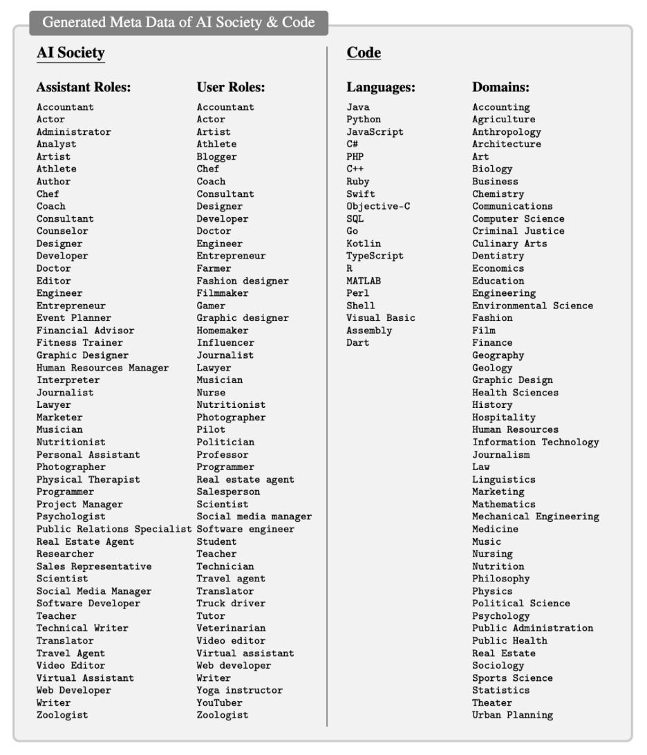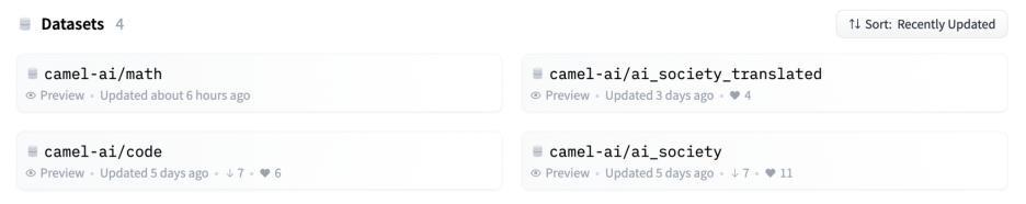 AI 社会和代码数据集的扮演角色文中作者展示了如何将角色扮演用于生成对话数据以及研究聊天智能体的行为和能力,为研究对话语言模型提供了新思路。总体而言,本文的贡献包括引入了一种新型的 LLM 智能体交流框架,该框架有潜力促进交流智能体之间的自主合作,此外,该研究还提供了一种可扩展的方法来研究多智能体系统的合作行为和能力。最后作者通过 CAMEL 框架让智能体扮演不同的社会角色,进而对 AI 社会进行了建模,并采集了大量自然语言指令数据集,目前 AI 社会、代码、数学和 AI 社会十种语言翻译等四个数据集已经可以在 HuggingFace 进行下载: