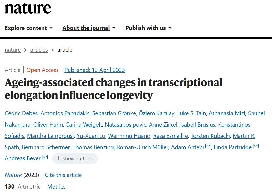 [1]Debès, C., Papadakis, A., Grönke, S. et al. Ageing-associated changes in transcriptional elongation influence longevity. Nature (2023).https://doi.org/10.1038/s41586-023-05922-y