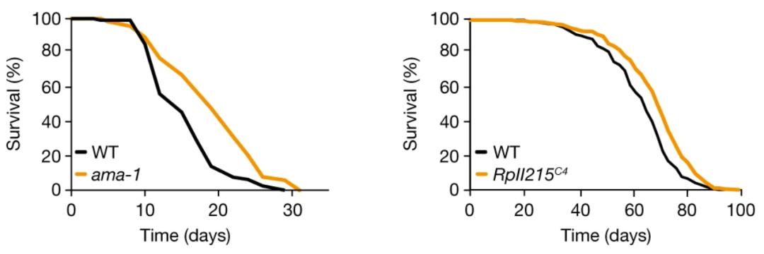 延缓RNA聚合酶Ⅱ延伸速度能显著延长线虫(左)和果蝇(右)的寿命