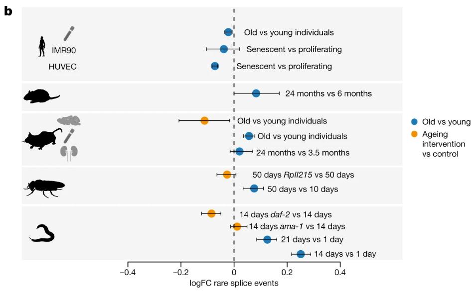 在线虫和果蝇中,伴随衰老的罕见剪接事件平均比例增加,而在延寿措施之下比例回落。不过在哺乳动物中并未观察到同样的现象,研究者认为这可能是由于哺乳动物细胞的剪接调节机制更为复杂。