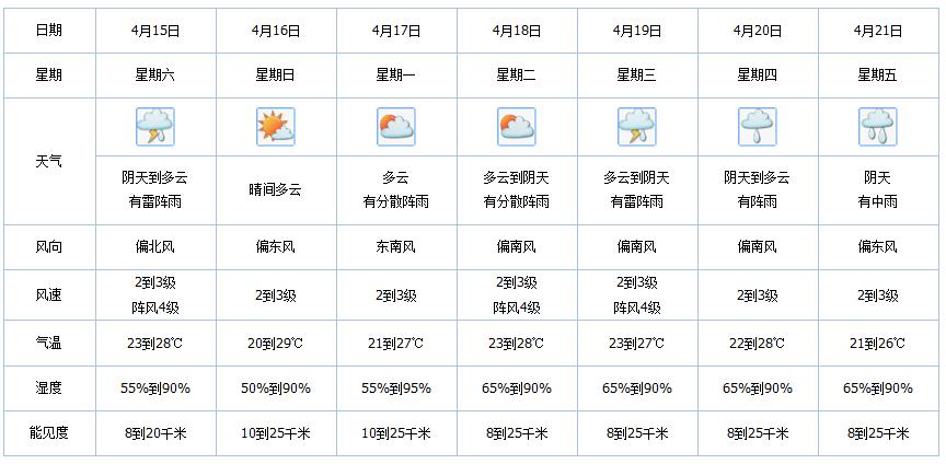 江门市气象台预计,15日有雷阵雨;16日晴间多云;17—18日有分散阵雨;19日起降雨频繁。春季气温多变,注意适时增减衣物,预防呼吸道感染等疾病。