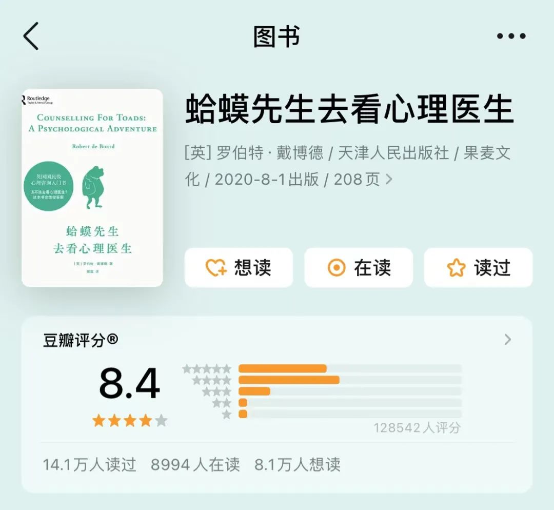豆瓣截图“3天看完了《蛤蟆先生去看心理医生》,就像自己也经历了一次疗愈。”