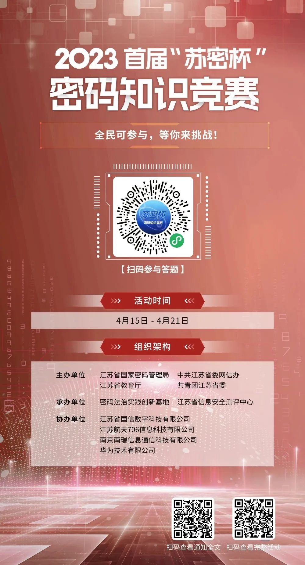 为全面贯彻落实总体国家安全观,营造知密码、懂密码、用密码的浓厚氛围,更好地扛起新使命、谱写新篇章,江苏省密码管理局、江苏省委网信办、江苏省教育厅、共青团江苏省委联合举办江苏省首届“苏密杯”密码知识技能竞赛。