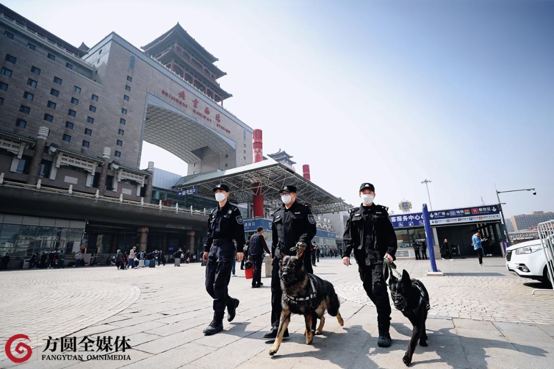 北京西站北广场,周钰健(左)与辅警手牵着两头东德牧羊犬“阿尤”和“哈哈”,正在执行专项查缉勤务任务。“是什么品种?几岁了?好帅啊!”口笼、脖圈、追踪背带、牵引绳,警犬装备齐全,看上去十分精神。执勤警犬是保障公共交通场所安全、秩序的重要力量。