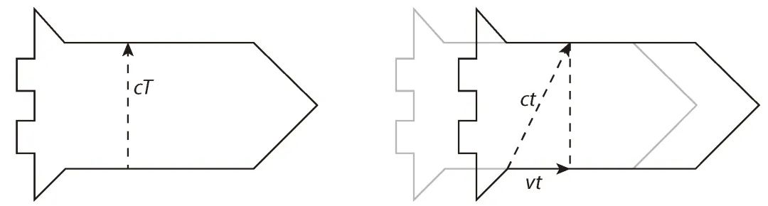 图2(左)展示了从机组人员的视角看实验的几何关系。对他们来说,光是垂直向上的。因为光的速度为c,所以行进的距离就是cT,用虚线箭头表示。图2(右)展示了从地面观察者的视角看实验的几何关系。宇宙飞船已运动了距离vt,因此光线沿斜线运动。由于光相对于地面观察者也以速度c行进,因此斜线的长度为ct。但虚线的长度与左图中虚线箭头的长度相同,即cT。根据毕达哥拉斯定理,