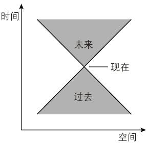 换句话说,原则上说,当且仅当在物理上可能在两个事件之间行进时,间隔才是实数。当且仅当光可以在两个事件之间传播时,间隔为零。这个物理上可以到达的区域被称为事件的光锥,它分为两部分:过去和未来。图3展示了空间约减到一维时的几何形状。