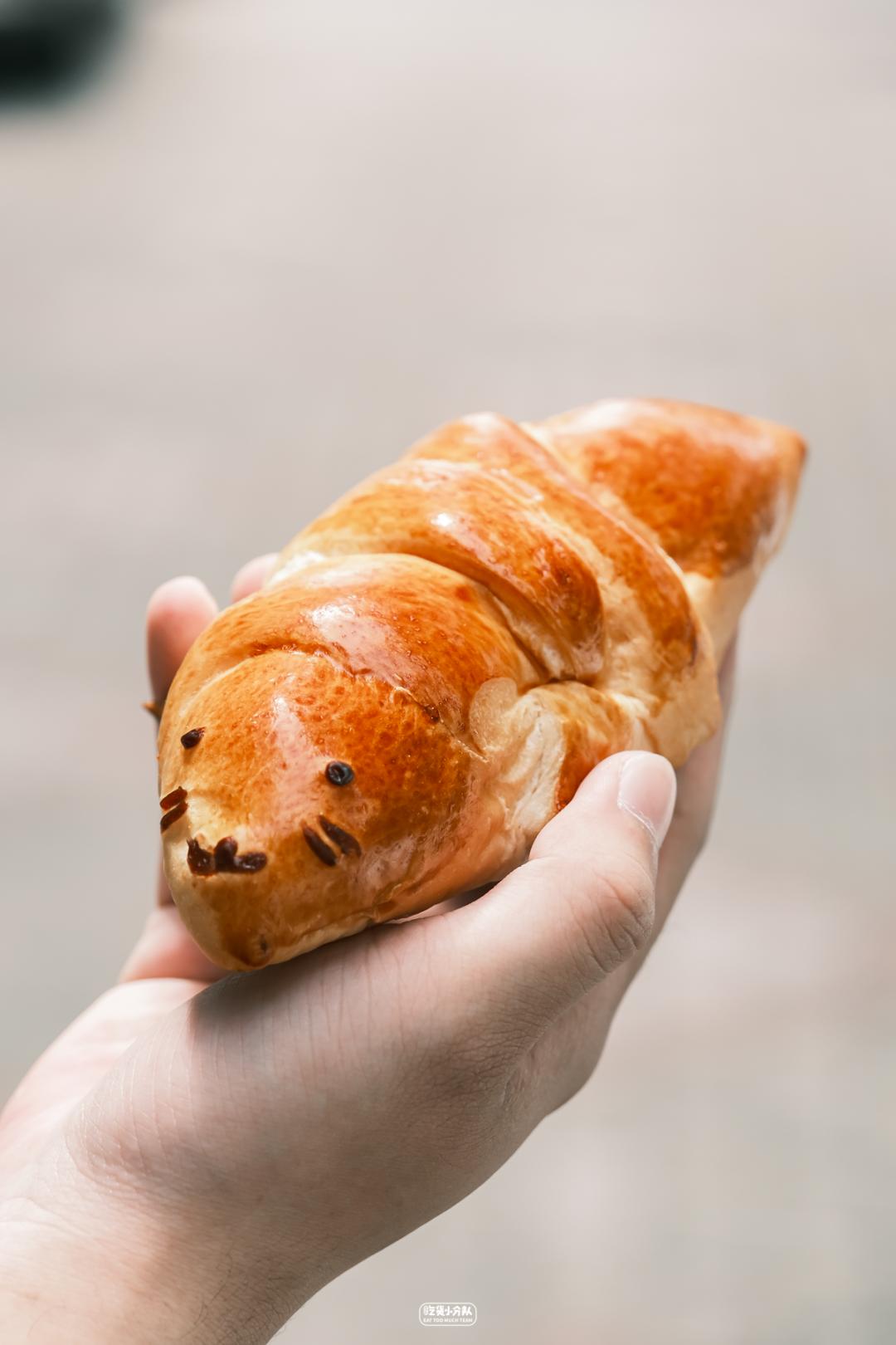 可爱到频繁出圈的水獭面包,是老板专门定制的,每天限量供应,汤圆起个大早过来买才拿到手。看着这可怜巴巴的小表情,又反而不舍得下嘴吃了。