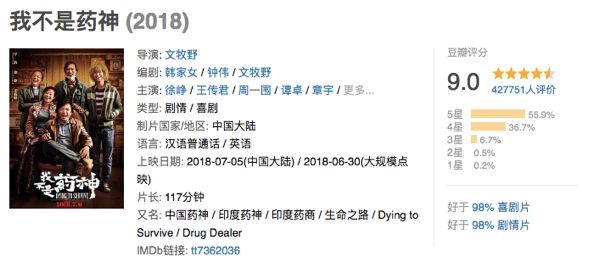 注:截止至2018年7月14日,《我不是药神》票房上映9天,突破20亿,恭喜《药神》!