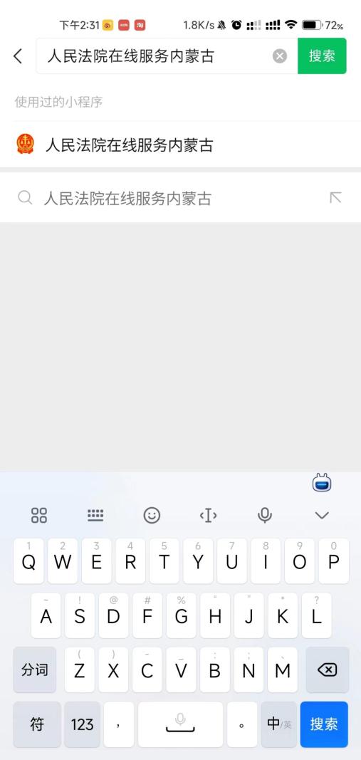 打开手机微信,下拉搜索小程序“人民法院在线服务内蒙古”,点击进入。