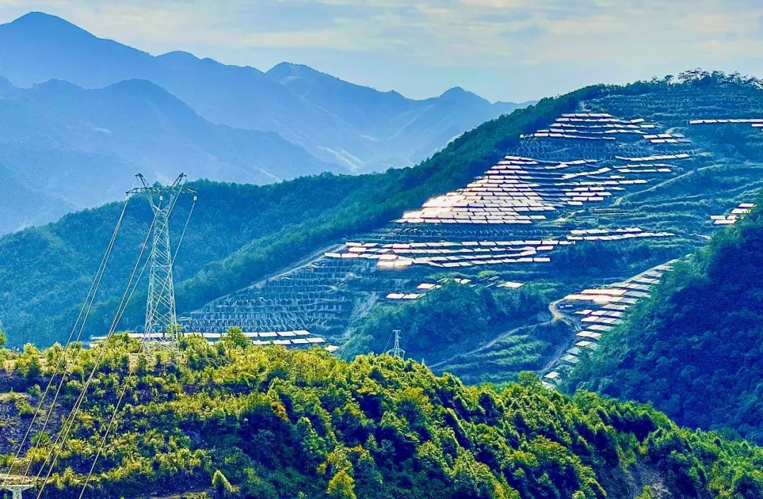 中国华电浙江磐安光伏项目现场,山间的万物都刚刚经历了春雨的洗礼,阳光即将透过厚厚的云层洒向大地。犬牙交错的山道上,一排排整齐的深蓝色光伏板铺满山坡,与远处翠绿色的群山交相辉映,它们即将把阳光转化为绿色的电力, 照亮“双碳”时代的未来。