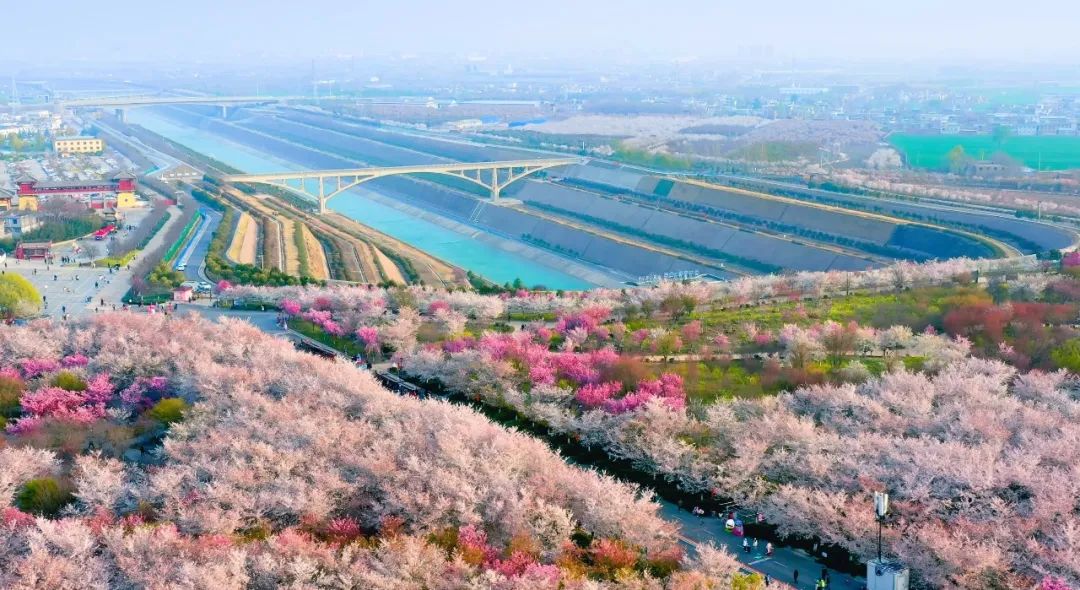 图为南水北调中线关键性控制性工程——穿黄工程。春日里从空中俯瞰,中线工程到黄河岸边、繁樱深处便隐去了身影,黄河南北两岸像放置了两把琴身相对的巨大吉他。中线工程看似被黄河隔开,但在河床下30米深处,滚滚南水通过两条长达4250公里的地下隧洞穿越黄河。
