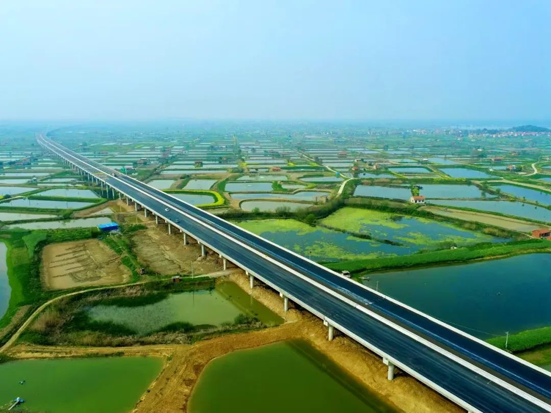 仲春时节,中国能建葛洲坝路桥公司承建的武阳高速公路(黄石段)正在加紧特大桥路面摊铺作业,掩映于湖光山色间的武阳高速东风农场特大桥如长龙卧波,飞架鄂(州)黄(石)两地,蔚为壮观。