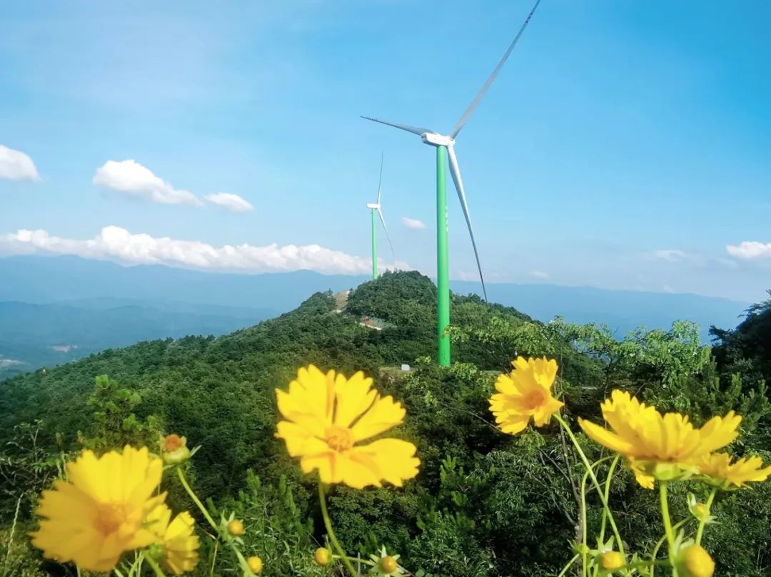 春风亦有信,花开正当期,在中广核新能源湖南分公司天塘界风电场,黄花在青山间摇曳绽放,大风车伴着春风生产绿能。