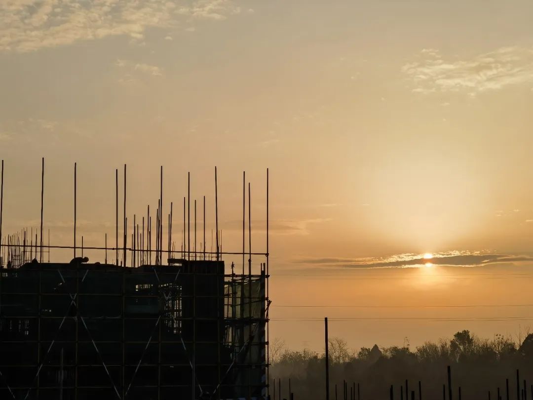 在中国航天科技集团有限公司七院四川航天建筑工程有限公司简阳放生坝项目的楼顶上,奋斗在一线的工人们,迎接清晨的阳光辛勤地工作。