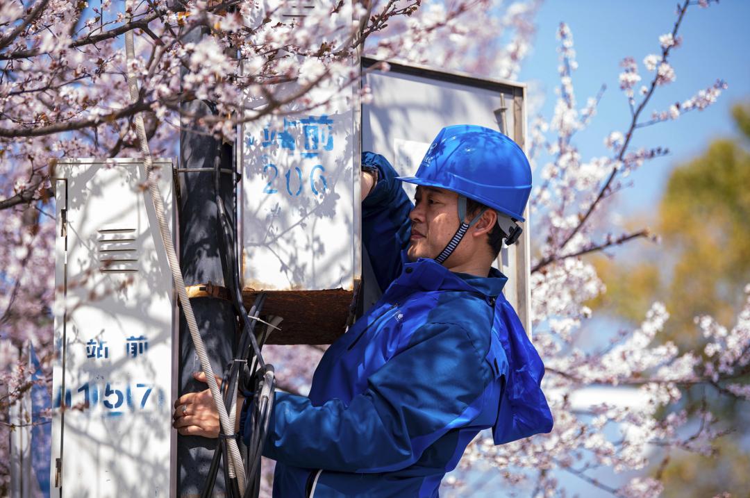 樱花开放,中国电信南昌分公司网络工程师在南昌湾里进行巡检,保障景区内中国电信智慧云眼视频监控系统正常运行。