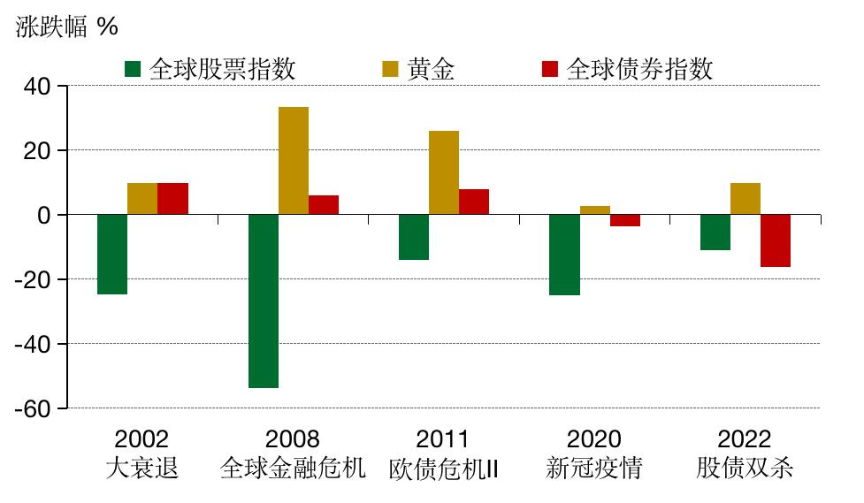 *截止于2022年12月 31日,基于MSCI全球股票指数,彭博全球债券指数以及伦敦金,均以人民币计价。大衰退: 3/2002 - 7/2002; 全球金融危机 (GFC): 10/2007 - 2/2009; 欧债危机 II: 2/2011 - 10/2011;新冠疫情: 31/1/2020 – 31/3/2020; 2022股债双杀: 2022全年。