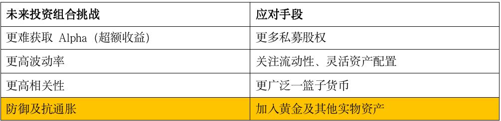 澳大利亚主权财富基金也在去年年底将目光转向了黄金。去年年底该基金指出,未来全球投资者可能会面临低增长,高失业率,高通胀的长期挑战。而为了让其投资组合更具防御性,能更好地抵抗通胀,澳大利亚主权财富基金加入了黄金(表1)。