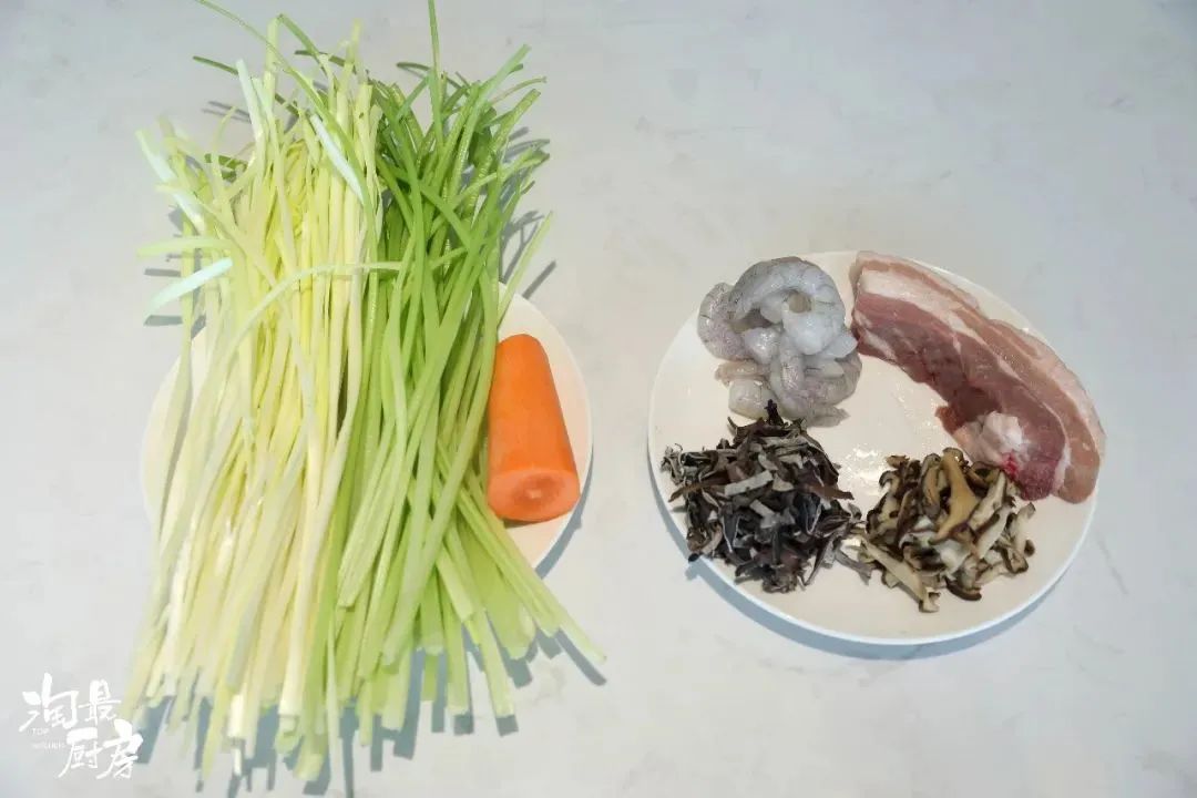 ● 食材准备/ 食材 / : 200g 虾仁、200g 五花肉、100g 木耳丝、100g 干香菇丝、150g 香芹、100g 韭黄、150g 胡萝卜