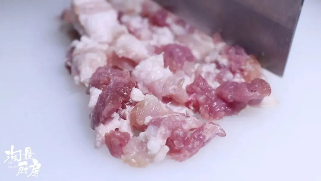 ❶ 用刀背碾碎去完虾线的虾仁,五花肉改刀剁碎。