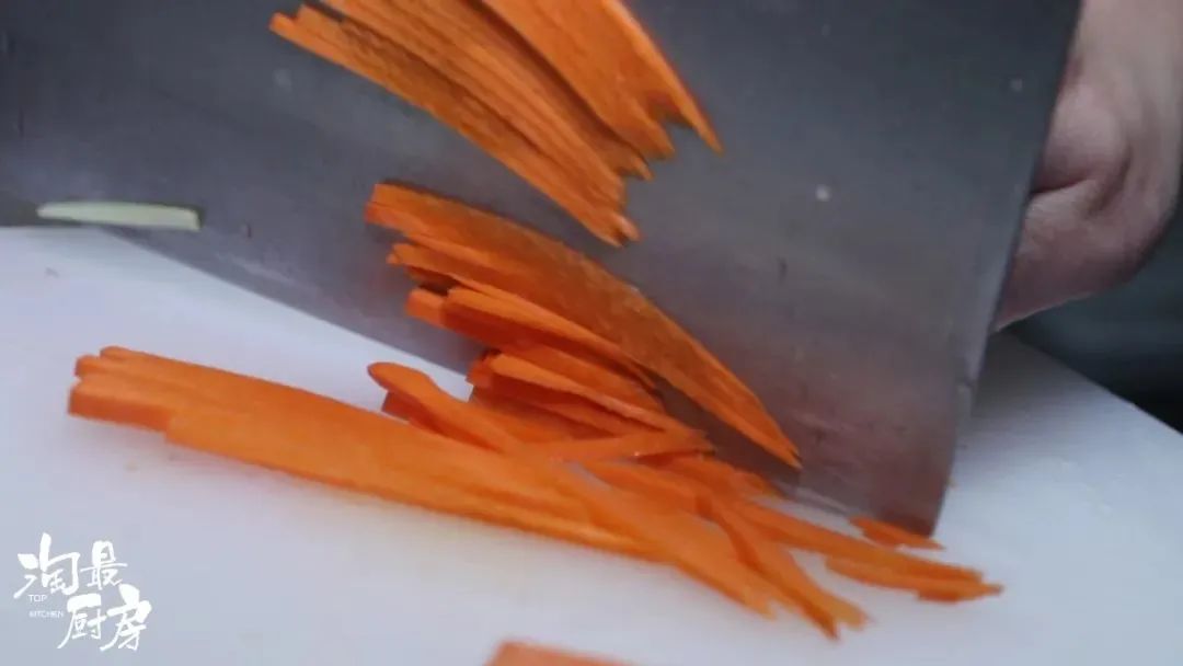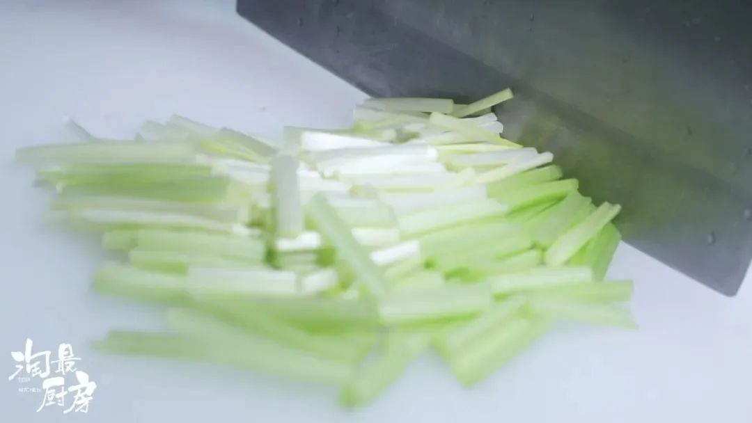 ❸ 芹菜和韭黄切断,胡萝卜切丝备用。