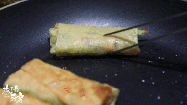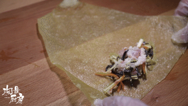 ❶ 平铺豆腐衣,放入3调羹(45g)馅料,边角一折,往前一卷一包。