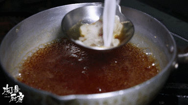 ❷ 提鲜!转小火,倒入1.5火锅勺(45ml)水淀粉勾芡。最后再转大火煮开。