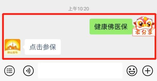 关注“佛山发布”微信公众号,在对话框发送关键词“健康佛医保”,即可点击链接进入参保入口。>>详细阅读:佛山发布