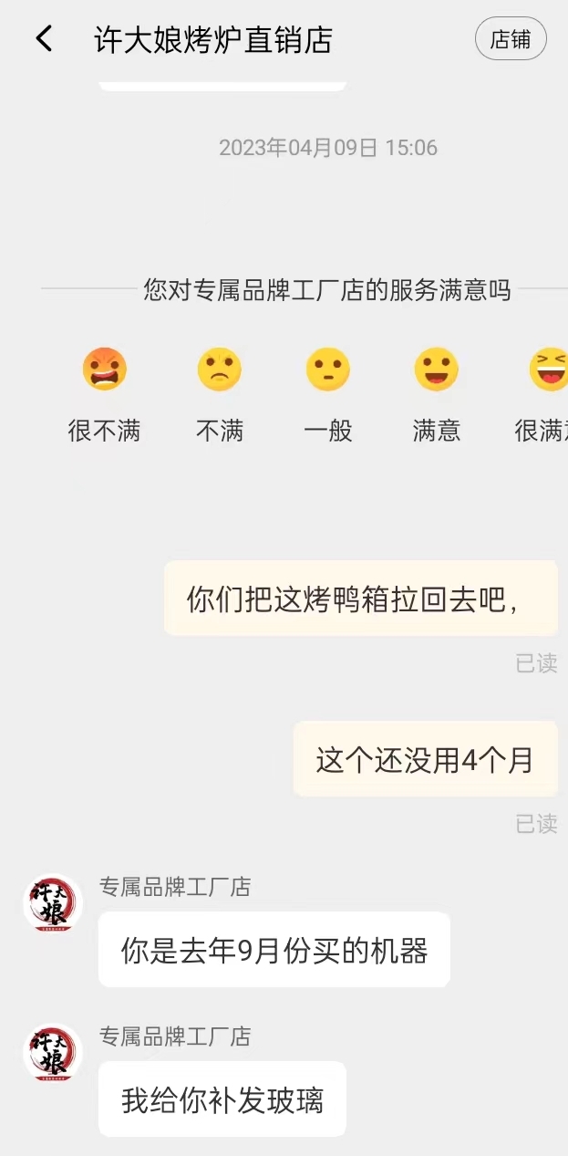 徐先生不同意商家的处理结果,并怀疑烤鸭炉存在安全隐患。于是他向淘宝客服反映了问题,要求商家解释爆炸原因并按原价折半赔偿1000元。