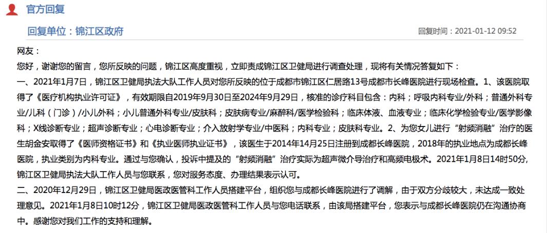 不过,也有不少患者反映长峰医院的治疗效果不佳。2018年,有成都市民反映成都长峰医院为其女儿进行面部血管瘤医治和修复,但在就医过程中,面部出现溃烂,造成了瘢痕和嘴唇裂口。2020年,锦江区卫健局曾帮助消费者与成都长峰医院进行调解,由于双方分歧较大,未达成一致处理意见。