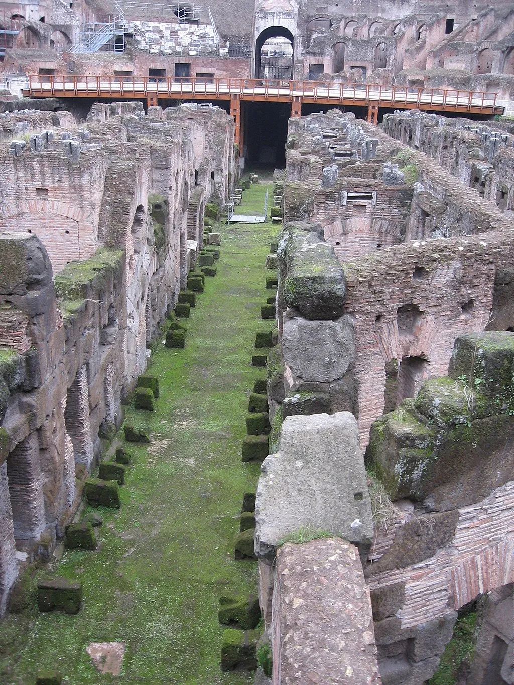 ©Kasa Fue, CC BY-SA 4.0, via Wikimedia Commons竞技场原本铺着木地板,上面覆盖着沙子。arena这个词就来源于拉丁语的harena(沙子)。沙子的作用是防止角斗士们滑倒,并吸收溅出的鲜血。场上的活板门连接着地下室(hypogeum)。一系列复杂的滑轮装置将笼中的野兽和各种战斗的布景抬升到竞技场上。