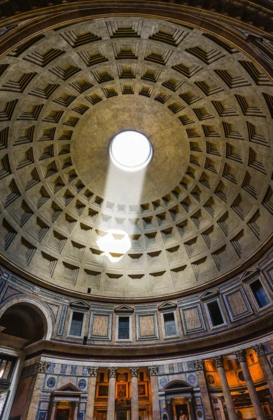©Nicholas Hartmann, CC BY-SA 4.0, via Wikimedia Commons进入之后,可以看到光线透过洞口(oculus;穹顶中央直径8.7米的洞)倾泻下来,让大理石贴面的圆柱形内部空间看起来广袤无垠,这一匠心独具的设计让参拜者立刻折服于神的伟大。