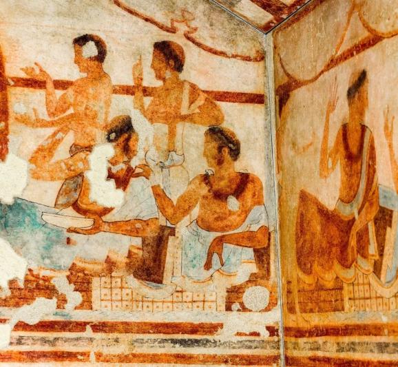 - 在塔尔奎尼亚仔细研究伊特鲁里亚人墓地的壁画 -