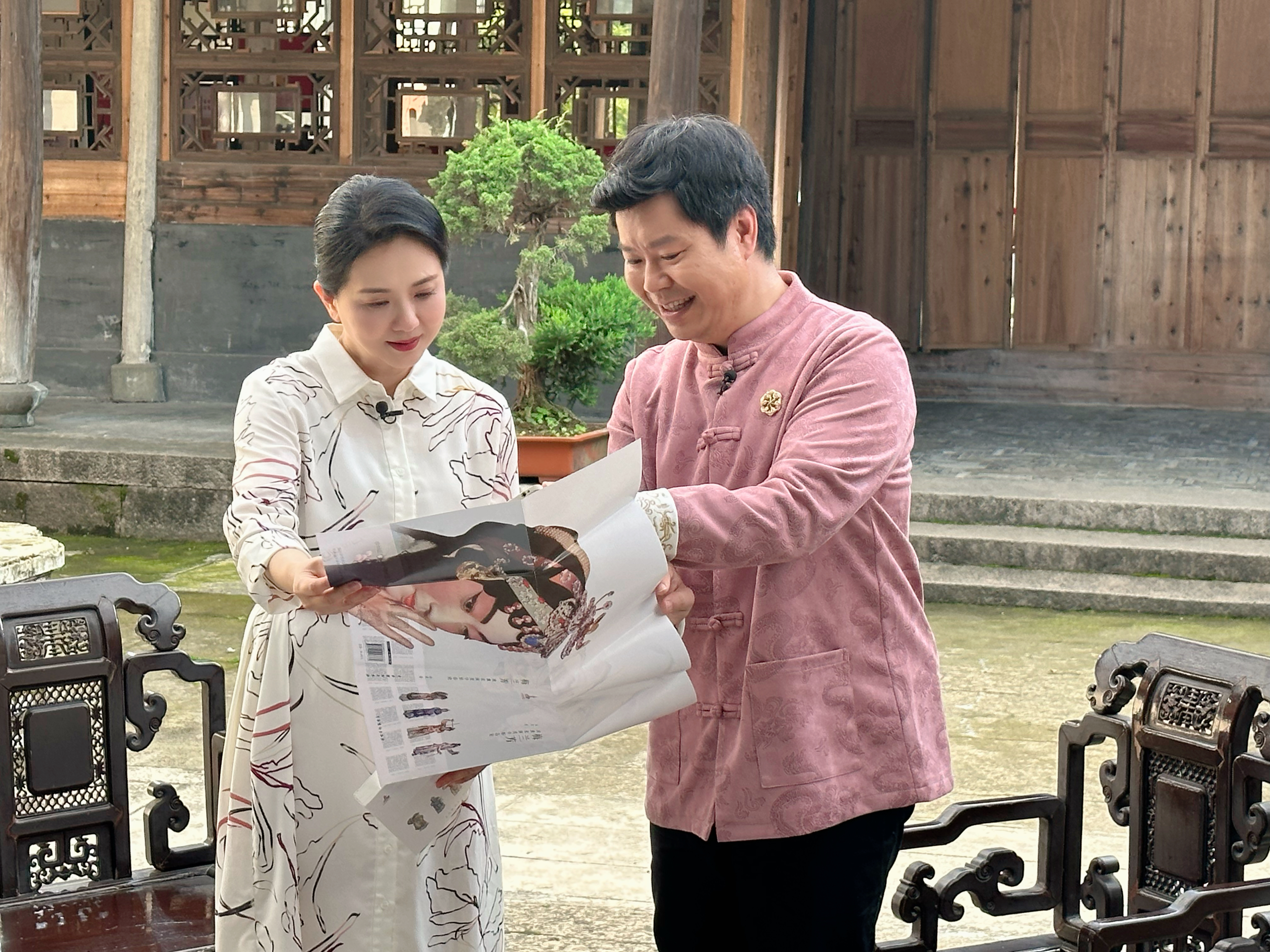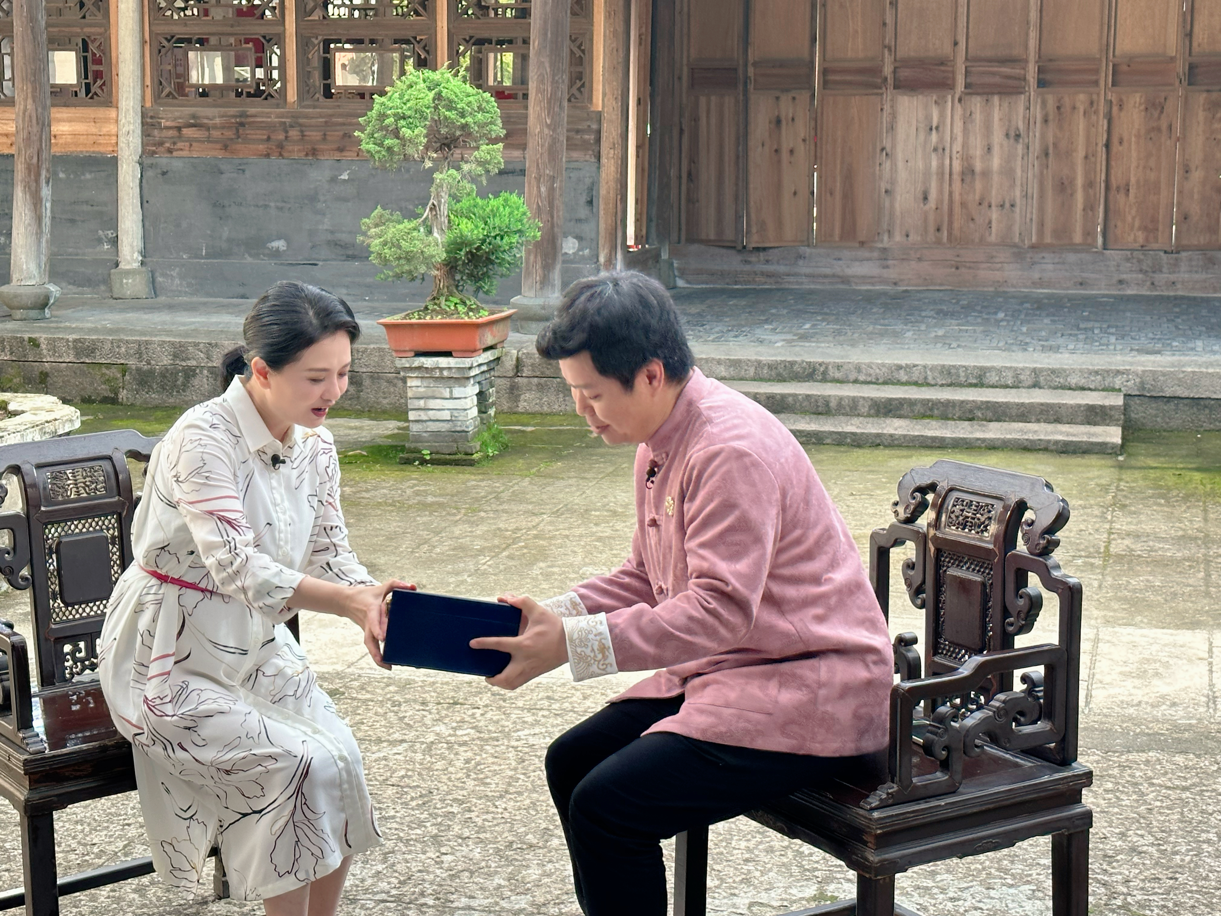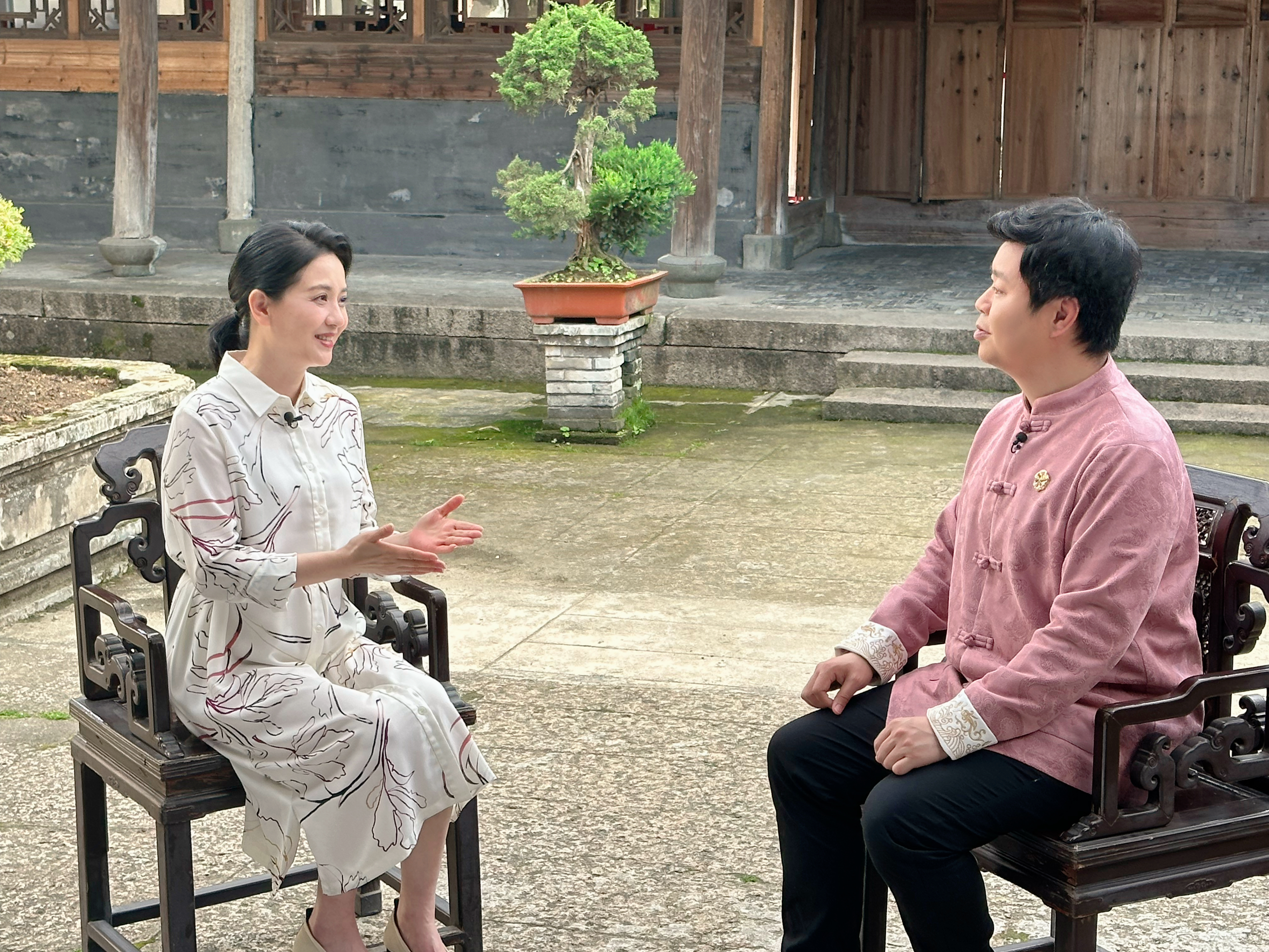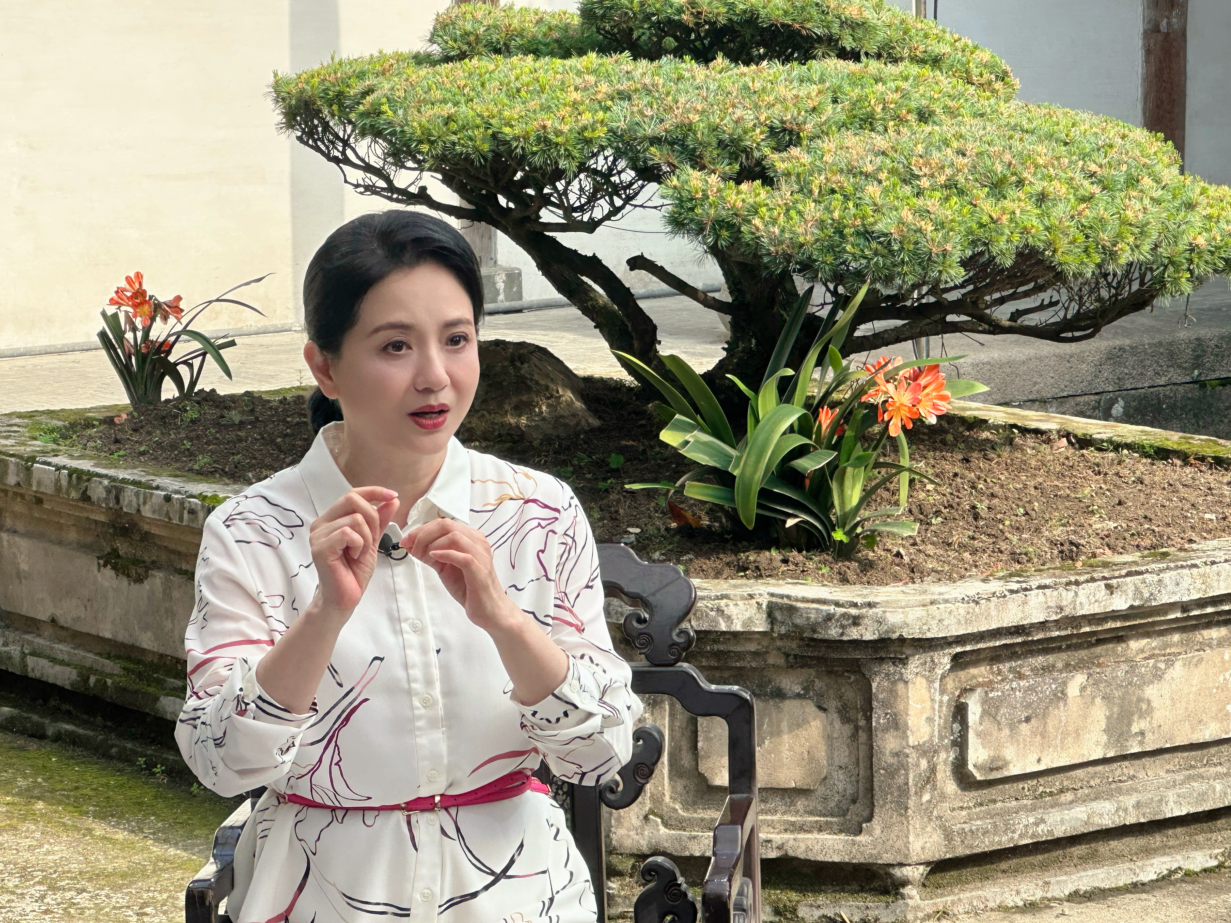 在玉海楼里,陶慧敏身着一身素雅的白色连衣裙静坐在木椅上,对话主持人池浚,讲述自己从戏曲舞台走入影视荧幕,开启绚丽的艺术人生。