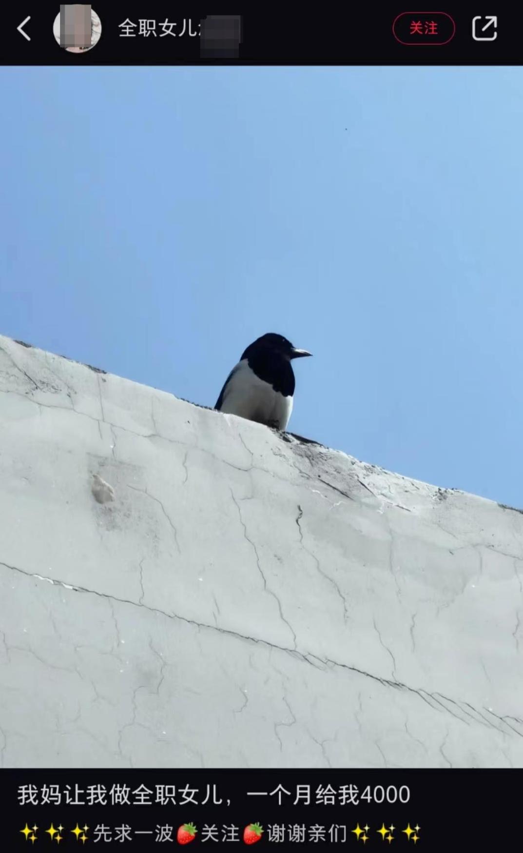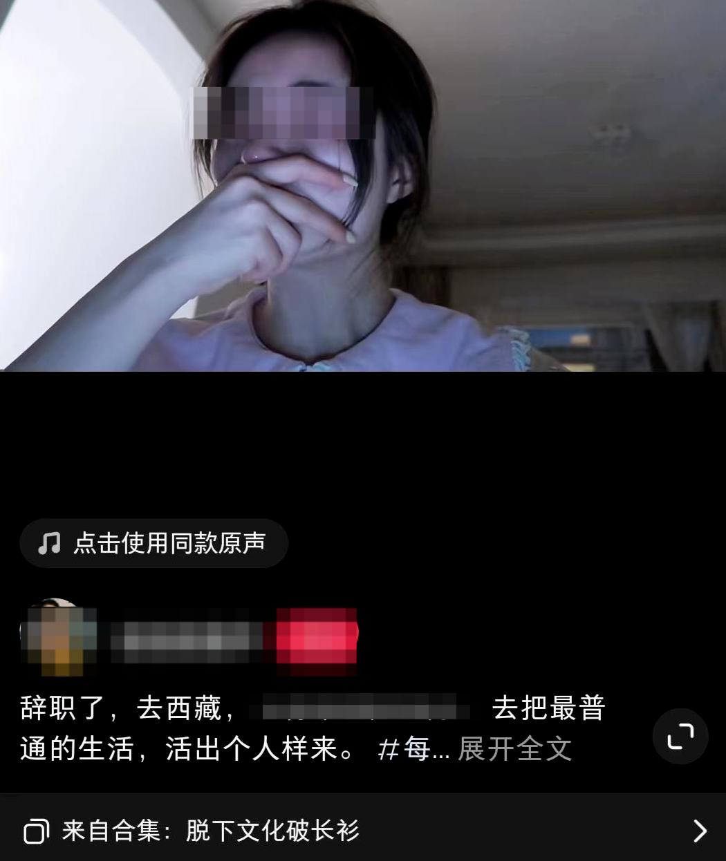 ↑一名“全职女儿”的社交媒体截图重庆人香芹毕业后选择留在昆明工作,家人则在西藏经商。工作几年之后,香芹发现自己几乎不可能在职场上成长,自己又不在父母身边,总是漂泊,有些“一塌糊涂”。辞去银行工作的香芹奔赴西藏,投入了家庭生活。香芹在社交媒体上展示的视频里,做出这个决定的时候,她眼眶通红,流下眼泪。