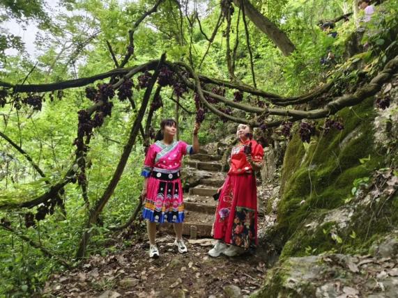 竹竿舞结束后,各族群众登五尖山赏禾雀花。禾雀花又名油麻藤、花汕麻藤、雀儿花,是国家二类保护植物。这个季节,万市紫色的禾雀花迎风开放,一串串的艳丽花朵,吊挂在盘曲的藤茎上,登山赏花也因此成为了槎源坞各族群众的习俗。一路上欢声笑语,山歌叠起,诉说着现在幸福的美好生活。