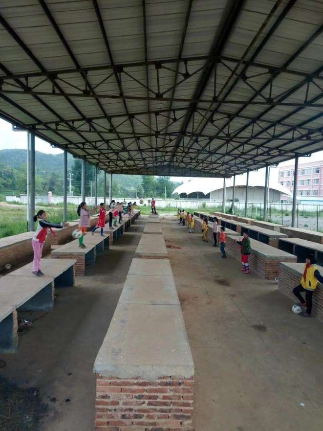 然而随着踢球的孩子越来越多,小球员们逐渐从这块菜地上“溢出”,跑道、水泥地上,随处可见孩子们踢球的身影。他们甚至把球踢进集市,用菜台做对墙反弹练习。直到2020年年底,这所小学终于有了第一块人工草坪足球场。