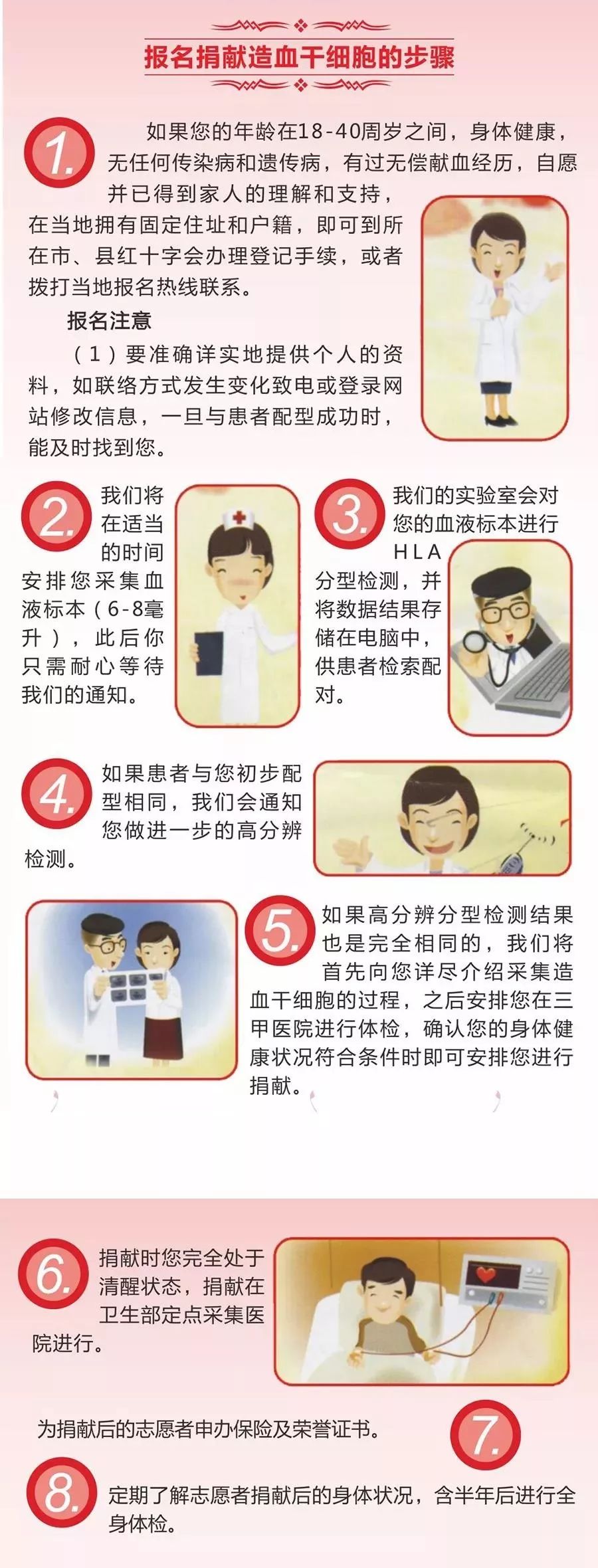 年龄在18-40周岁,身体健康,经历无偿献血,家人同意,单位支持,在本地有比较固定的工作或住所,报名前深思熟虑、报名后捐献意向坚定,有行为能力的自然人,在各市中心血站献血的同时,填写志愿捐献造血干细胞同意书及有关表格,并提取6毫升血液样品。配型实验室将会对您的血液进行HLA分型等检验,并把您的相关资料录入中国造血干细胞捐献者资料库的计算机数据库中,以供渴望移植治疗的患者寻找配型,这样您就成了一名光荣的造血干细胞志愿者。