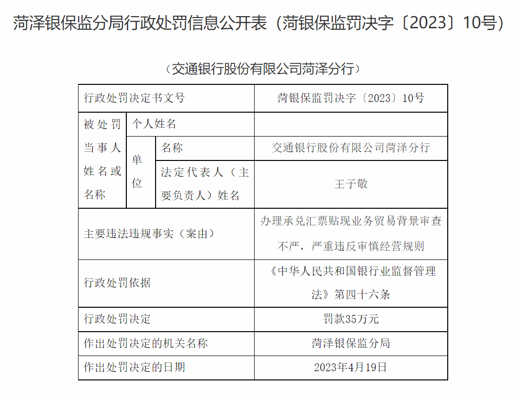 菏泽银保监分局行政处罚信息公开表(菏银保监罚决字〔2023〕10号)显示,交通银行股份有限公司菏泽分行存在以下违法违规事实:办理承兑汇票贴现业务贸易背景审查不严,严重违反审慎经营规则。中国银行保险监督管理委员会山东监管局菏泽银保监分局根据《中华人民共和国银行业监督管理法》第四十六条的有关规定,对交通银行股份有限公司菏泽分行罚款35万元。作出处罚决定的日期为2023年4月19日。