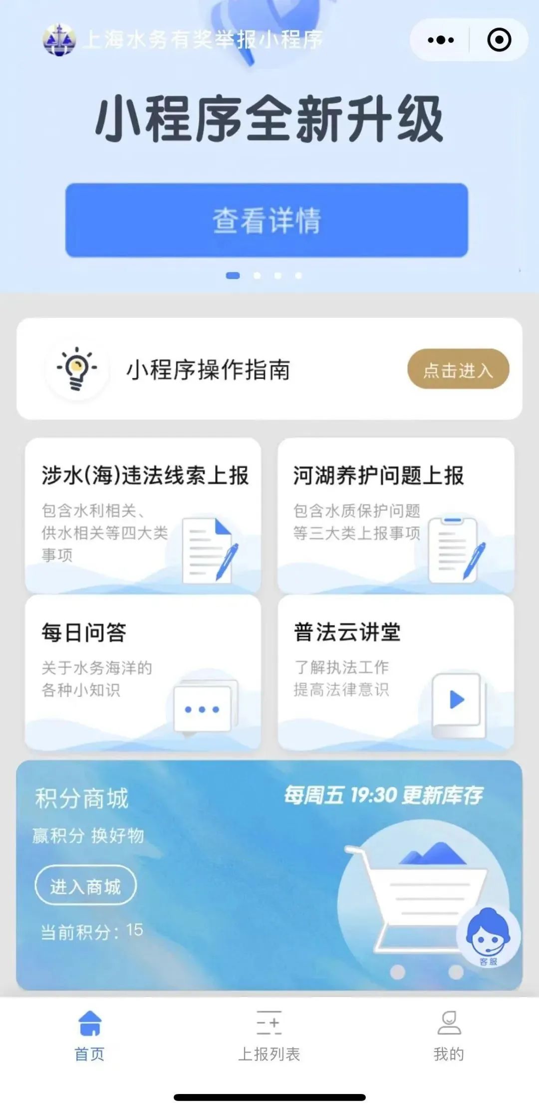 小程序举报“涉水违法”问题 ,最高5万元奖金“上海水务有奖小程序”已升级到2.0版,上线3个月来,累计收到涉及违法取用河道水、违法填堵河道、向排水管道排放施工泥浆、打深井取水、违法涉河施工、危害海塘滩涂安全等违法线索共70件。其中实地核查立案10余件,发出举报奖励7000元。