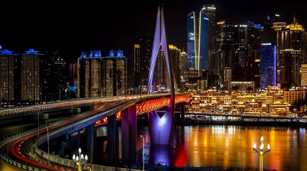 第七站:江北嘴江滩公园,解锁另一个视角的洪崖洞夜景,这里可以同时拍到洪崖洞、千厮门大桥,还有渝中区层次丰富的高楼大厦,包括来福士大厦,整个感觉就很赛博朋克。江边非常适合拍夜景人像,与洪崖洞来张合影很不错。