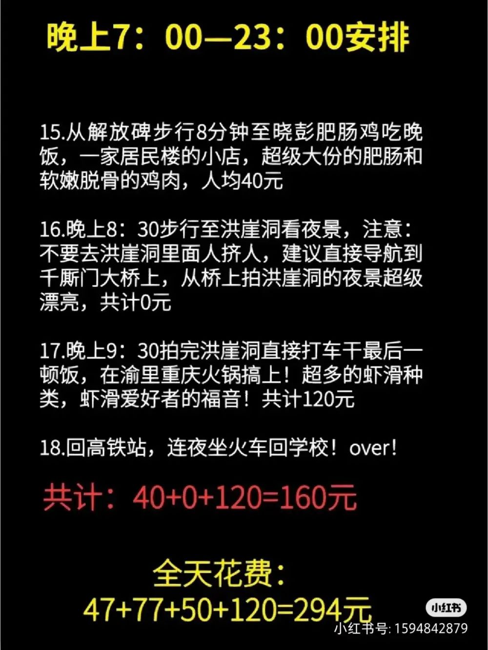 一天之内游览重庆城区主要网红打卡地,一个人的交通费加上餐费,包括打的和吃一顿火锅需要多少钱?因为每一位游客的情况不一样,这个费用也不尽相同。有网友晒出他的费用,一天下来交通费加上四顿饭钱,还包括一顿火锅,一共花了294元,堪称节约。