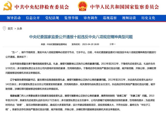 本周,中央纪委国家监委公开通报十起违反中央八项规定精神典型问题。被通报的党员干部里,包括5名中管干部。在他们违反中央八项规定精神的各种问题中,有一个共性问题——违规接受宴请。