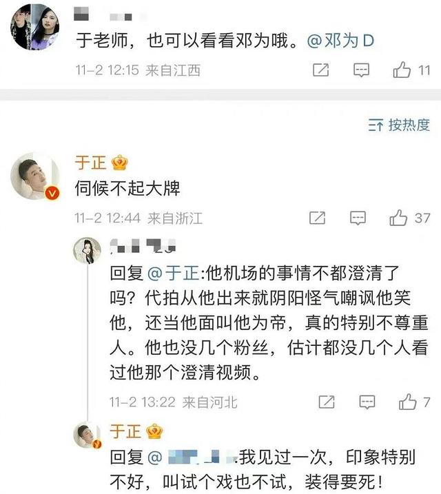 光是名字在内娱有点查无此人,桃努力回想,前段时间似乎在于正老师的评论区出现过。有粉丝给推荐“于老师看看邓为吧”,于正给一口回绝:“装得要死,伺候不起大牌。”