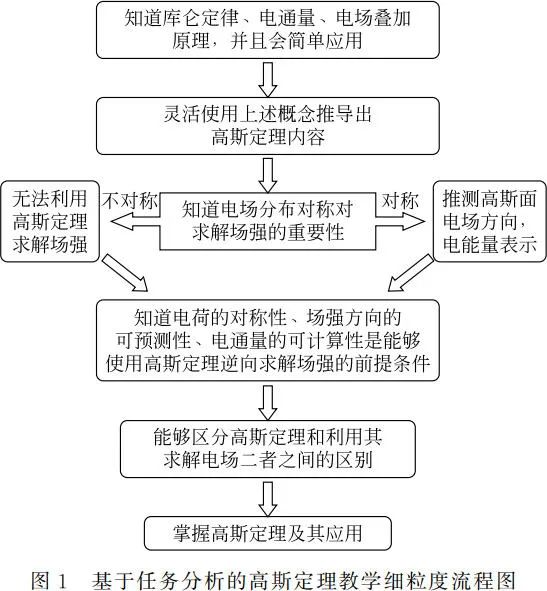 针对学生存在的问题,匹兹堡大学的研究小组开发了一系列相应的辅导课程来帮助提升学生对高斯定理等相关概念的理解[2-5]。开发辅导课程要求:(1)课程应建立在学生的前概念知识上;(2)营造一个积极地学习环境供学生交流以建立良好的知识结构;(3)提供支架、指导和反馈,给学生提供组织、重建和扩展知识的机会[2]。研究小组还提出可以通过任务分析的方法做出高斯定理的细粒度流程图,教师借用流程图有助于帮助学生渡过知识难点从而提升对概念的理解[5]。