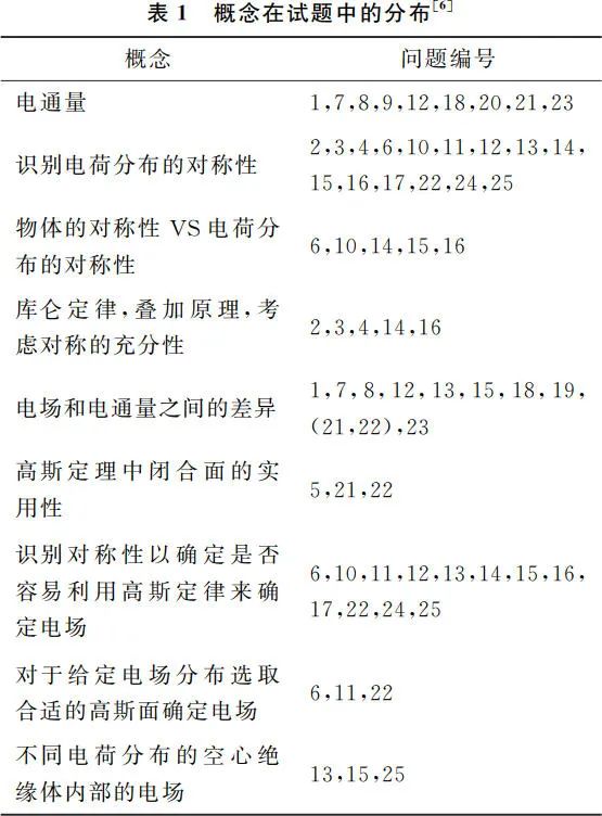 课程结束后我们对学生进行了时长 50 分钟的概念测试。试题采用匹兹堡大学 Singh 研究组设计开发的“电场对称性和高斯定理理解”测试,包含 25 个选择题,内容涉及高斯定理及一系列相关概念(详细内容见表 1)。该测试被证明具有良好的信效度,可获得学生概念理解程度的定量信息[1]。试题测试结束后,为了探查学生出现错误的原因,我们同时进行了两项工作。第一,我们参考表 1 的试题概念分布,聚焦试题的重点干扰项,对学生可能存在的概念问题进行分析。该分析过程分三步:(1)本文的两位作者独立对难度低于 0.7 以下试题的干扰项进行成因分析;(2)对分析结果进行一致性比对,其中大部分结果基本保持一致,而个别题目经共同协商后也能达成一致;(3)将试题分析结果与高斯定理教学流程图以及已有研究相结合,归纳整理学生在高斯定理理解方面的困境。第二,我们针对测试中错误较多的题目进行了学生小组访谈。小组一般由三到四人组成,访谈过程中,教师让学生针对试题进行讨论并给出最终答案,访谈过程全程录音。