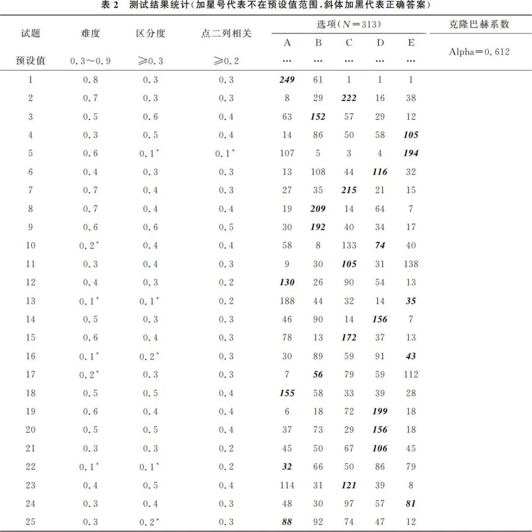 表 2 给出概念测试的各项统计数据,可以看到试题难度、区分度、点二列相关系数大部分都处于预设值的合理范围,克隆巴赫系数为 0.612。鉴于中美教学文化、行文风格的差异以及试题多概念关联的特性,因此该信度尚属可接受的范围。