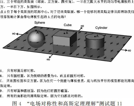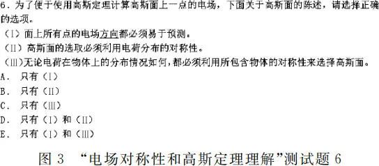 在第 6 题中(见图 3),有的 1/3 学生认为只要满足(Ⅰ)(Ⅱ)中的一个就可求解电场。有将近 1/4 学生认为,必须利用物体的对称性来选择高斯面。在讨论时学生表述如下(这里以及后面访谈内容都将隐去学生真实姓名,用字母代替):
