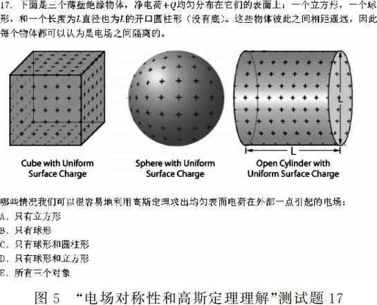 在 17 题中(见图 5)有 80%以上的人认为立方表面均匀带电体或开口圆柱表面均匀带电体能够求解其外部电场。以下给出学生在 17 题中的讨论: